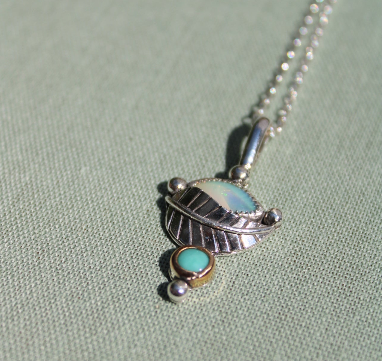 This one of a kind Botanical Pendant features a stunning opal set in a serrated silver bezel. A turquoise stone set in a 14k gold-filled bezel, complemented by a hand forged silver leaf. Silver embellishments surround the stones.