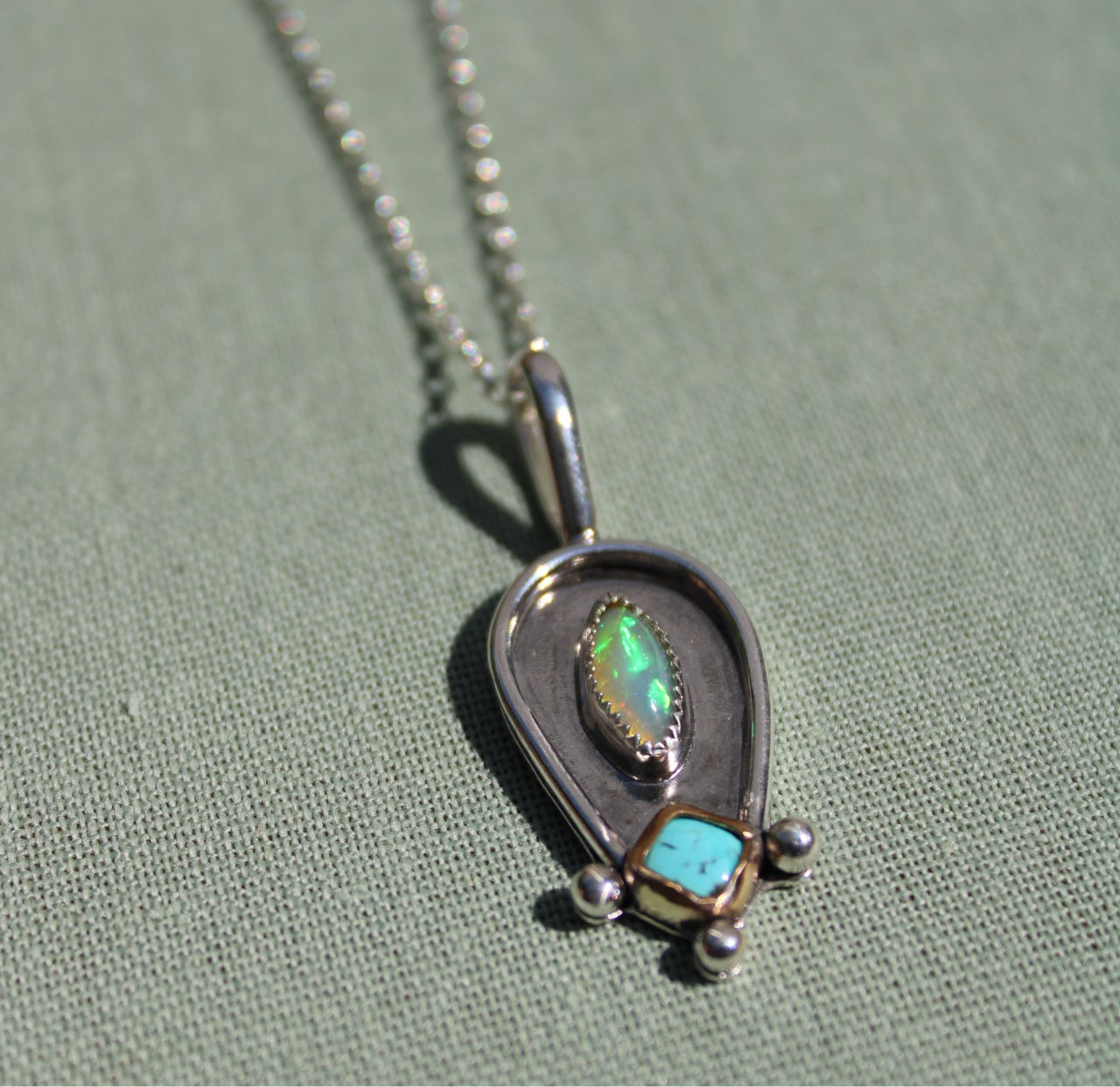 This exquisite pendant features a blend of opal and turquoise stones, set in sterling silver and 14k gold fill. With a sterling silver border and three sterling embellishments that enhance its natural beauty.