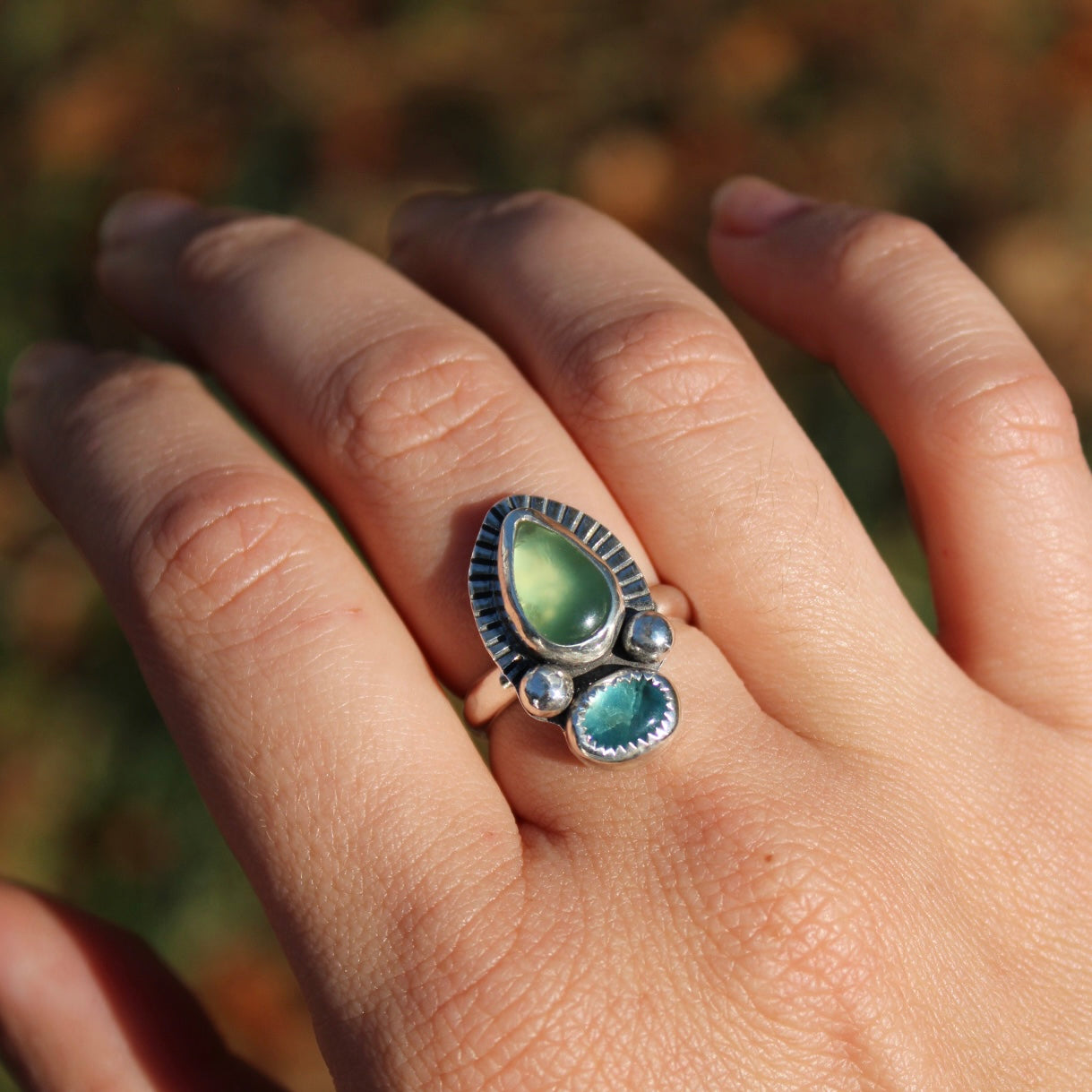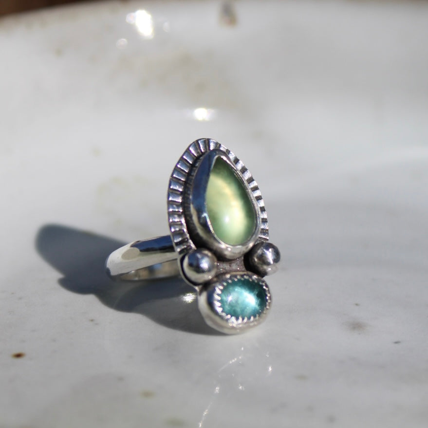 The Radiant Ring is a truly unique piece crafted with sterling silver and adorned with prehnite and apatite stones. Carefully set in sterling silver bezels.