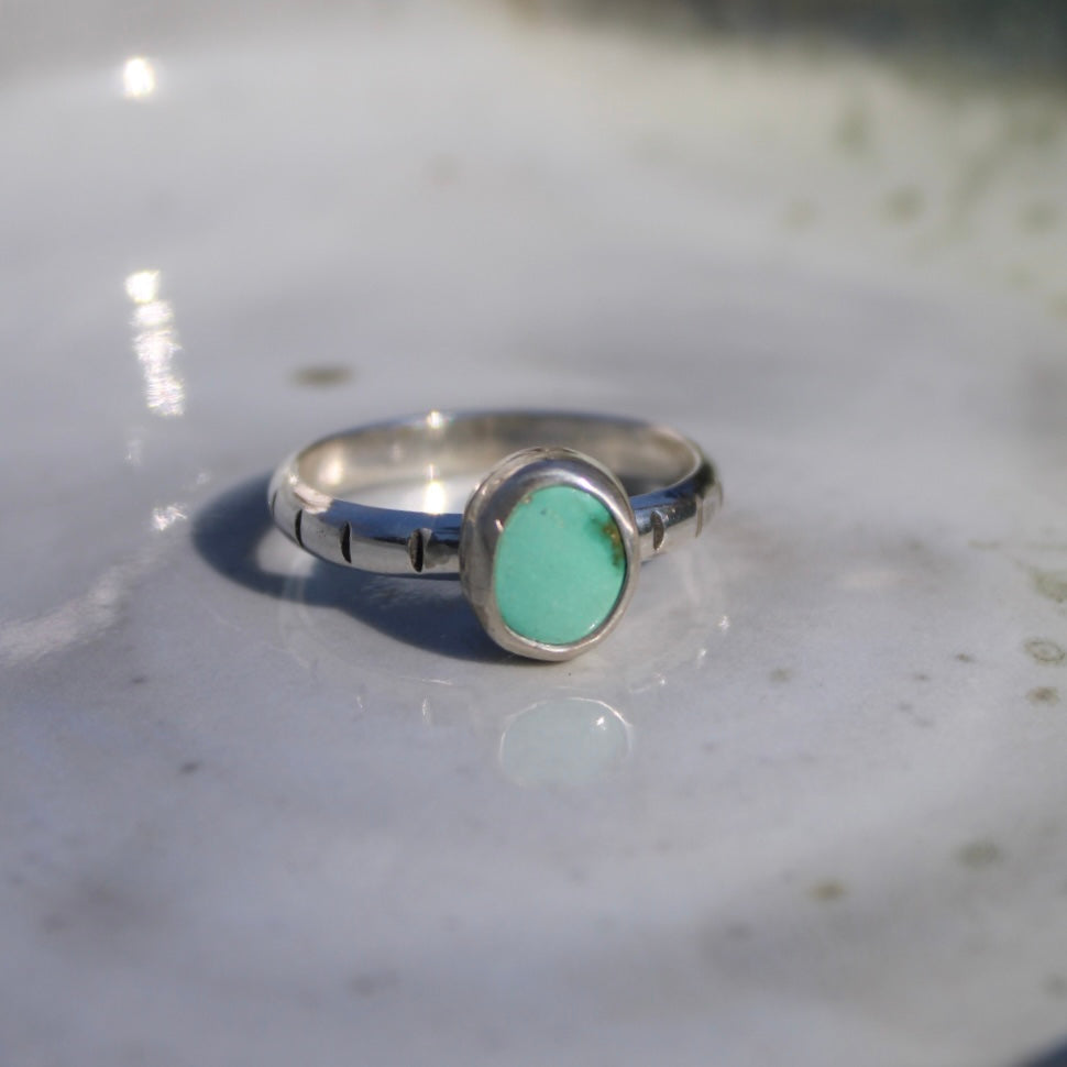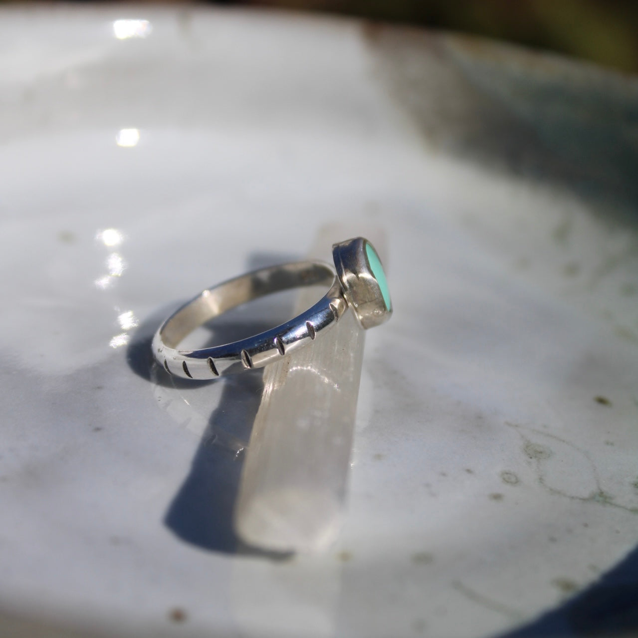 This handcrafted ring features a stunning verde valley turquoise stone set in a smooth silver bezel. Hand stamped details on the band. Size 10.