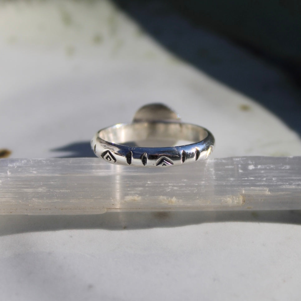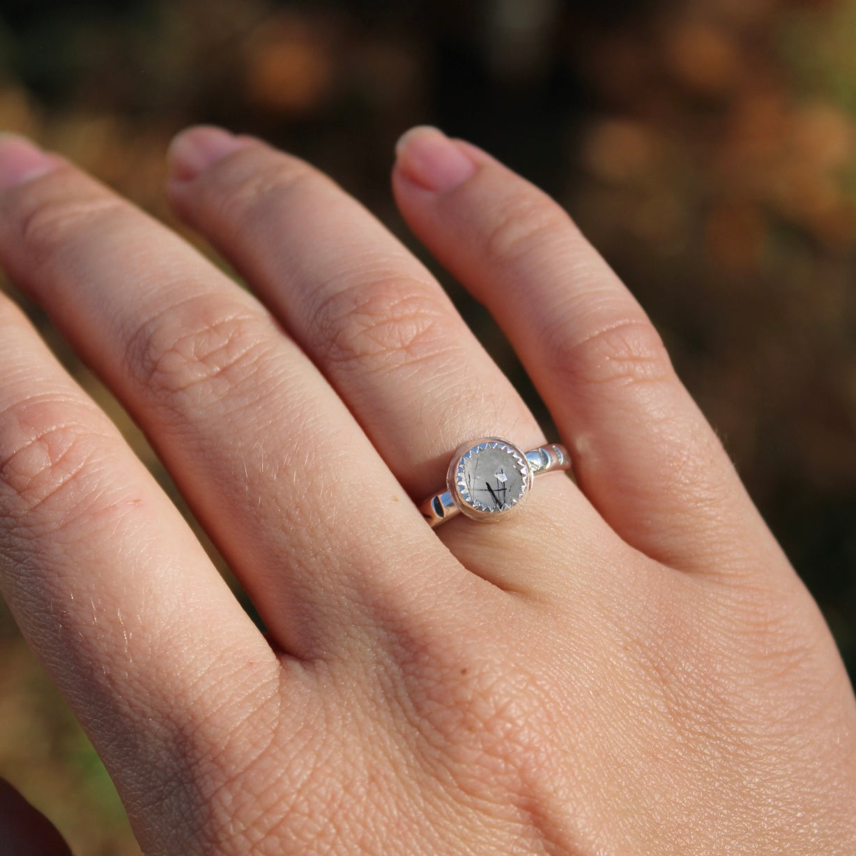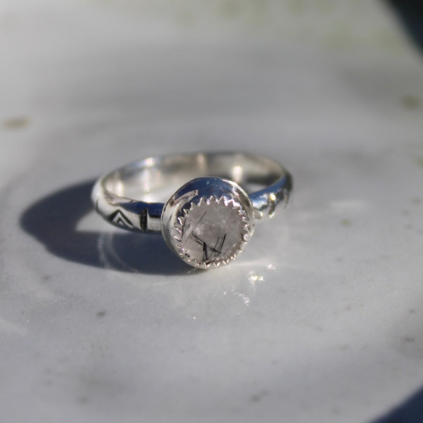 This ring is one of a kind featuring a faceted tourmalinated quartz. (Black tourmaline in quartz) The stone is set in a serrated sterling silver bezel. The band features hand stamped accents.