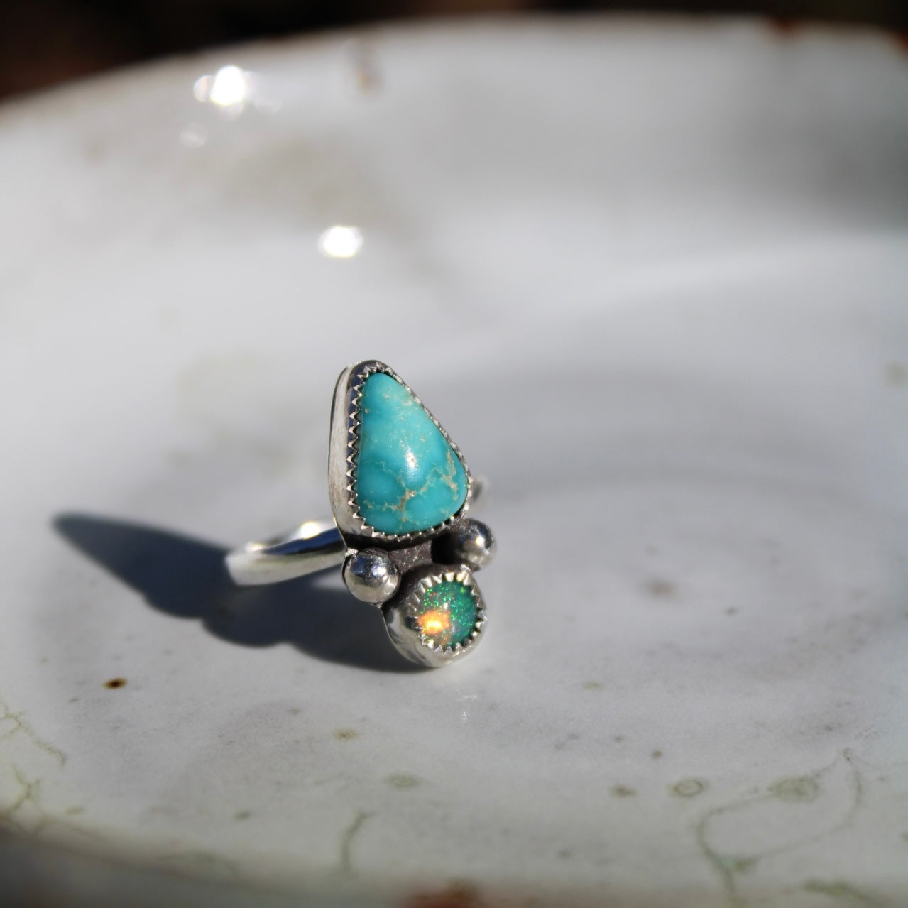 This one of a kind ring is handcrafted with sterling silver, featuring a whitewater turquoise stone and Ethiopian opal set in serrated bezels. It’s the perfect size for everyday wear.